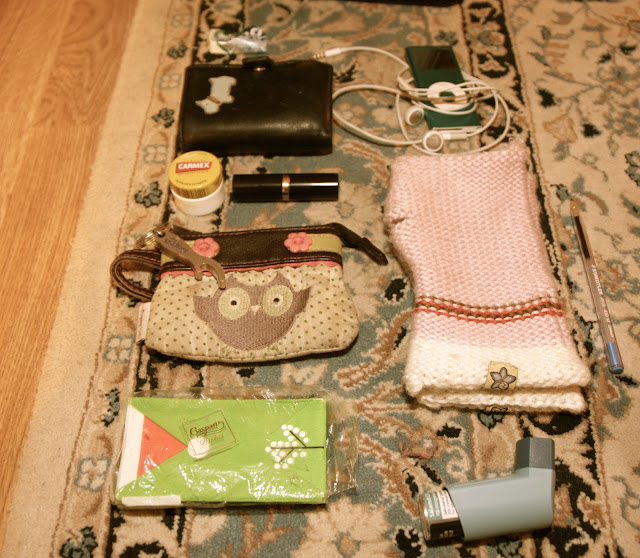 This bag is a medium size, it fits at most ( so that it only just closes ) – my diary, 2 purses, phone, book, lipstick, carmex, inhaler, ipod and train card holder. As you will see I didn’t have that much in it when I took these photos. I have always said that what is in my bag changes from day to day and I still stand by that.