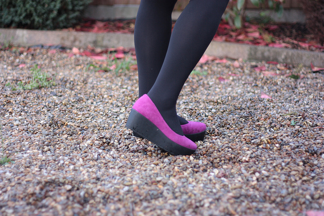I have been wearing lots of bright colours over the last few weeks and this week was all about purple. If you checked the link just before you will have listend to a fab song of which I sometimes think about it’s meaning. It could be about a crazy woman dressing in purple because it’s comforting and warm. It could also mean that people who wear purple want to stand out form the crowd by wearing this bright and loving colour. I am happy to grow as a crazy woman who loves purple because it makes me feel good. My Vagabond Gaga shoes are very comfortable and give me just enough height to make me feel a little more confident. I wear black tights most of the time when I am in work so it’s good to break up the black with some fun brightly coloured shoes.