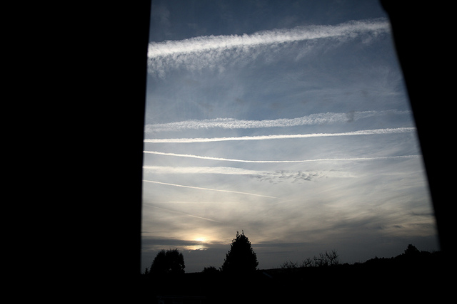I was sitting on my bed sorting through some old notebooks when I glanced out of my window. The sky looked very busy and quite beautiful. I quickly stumbled around my room to find my camera, pulled off the lens cap and climbed up onto my desk. I took these photos through the window and sat watching as the clouds moved on and the contrails faded. I am pretty pleased with how they came out.