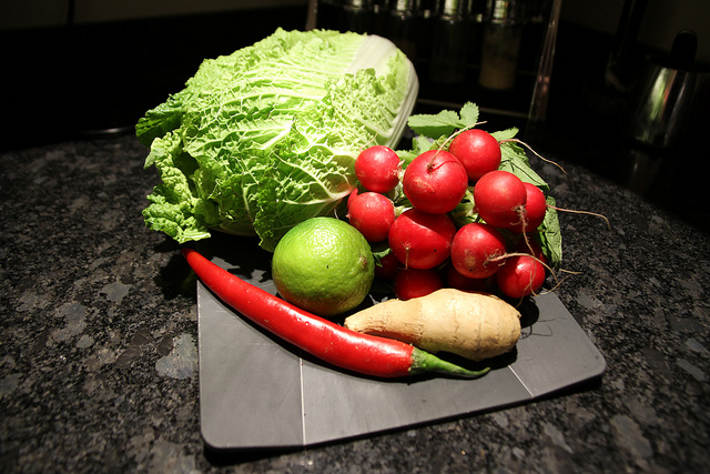 Slice the Chinese leaf in half.