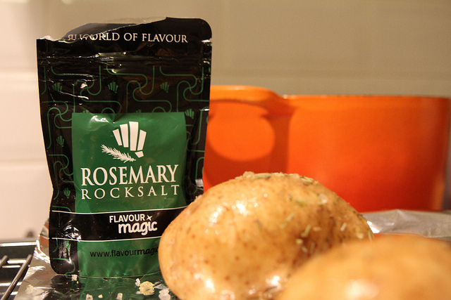 3 – Done? Right, now you want to get some chunky rock salt and spread it over the potato. I used this fancy rosemary rock salt which came in my Flavrbox