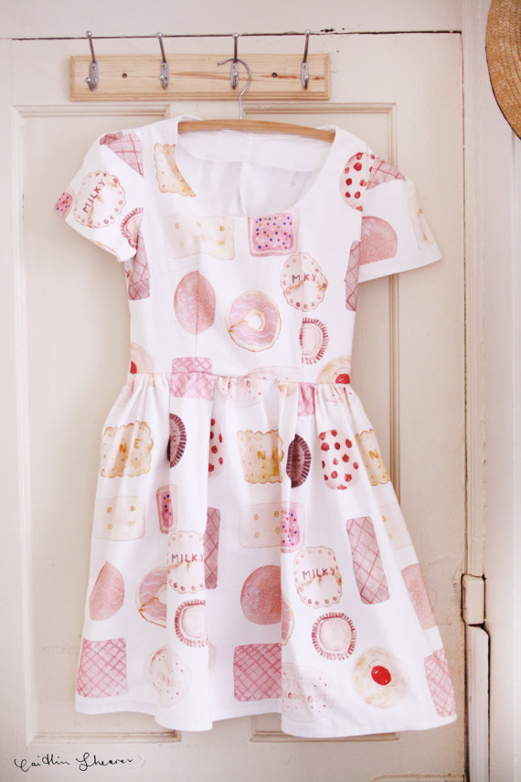 Caitlin Shearer is an illustrator and textiles designer. She’s based in Sydney and has an Etsy shop filled with the most beautiful dresses made from her own designed fabric. It had been quite some time since I last browsed through Caitlin’s shop. I found a link to it within one of my own blog posts, headed straight over and within seconds this biscuit covered dress had caught my eye. I wont be making any purchases at the moment as I’m in the process of starting new jobs, moving and cutting down on the things I own. However, as soon as the move is made, I’ll be heading right back to Caitlin’s shop.