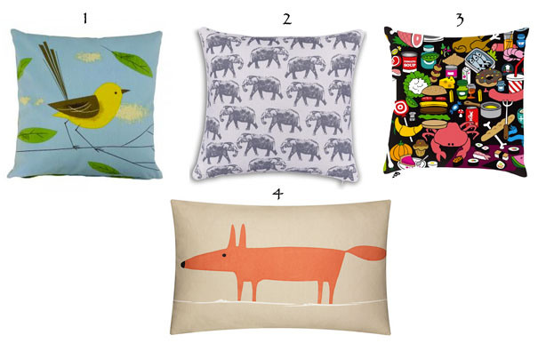 1 – Wagtail cushion 2 – Elephant cushion 3 – Food cushion 4 – Mr.Fox cusion