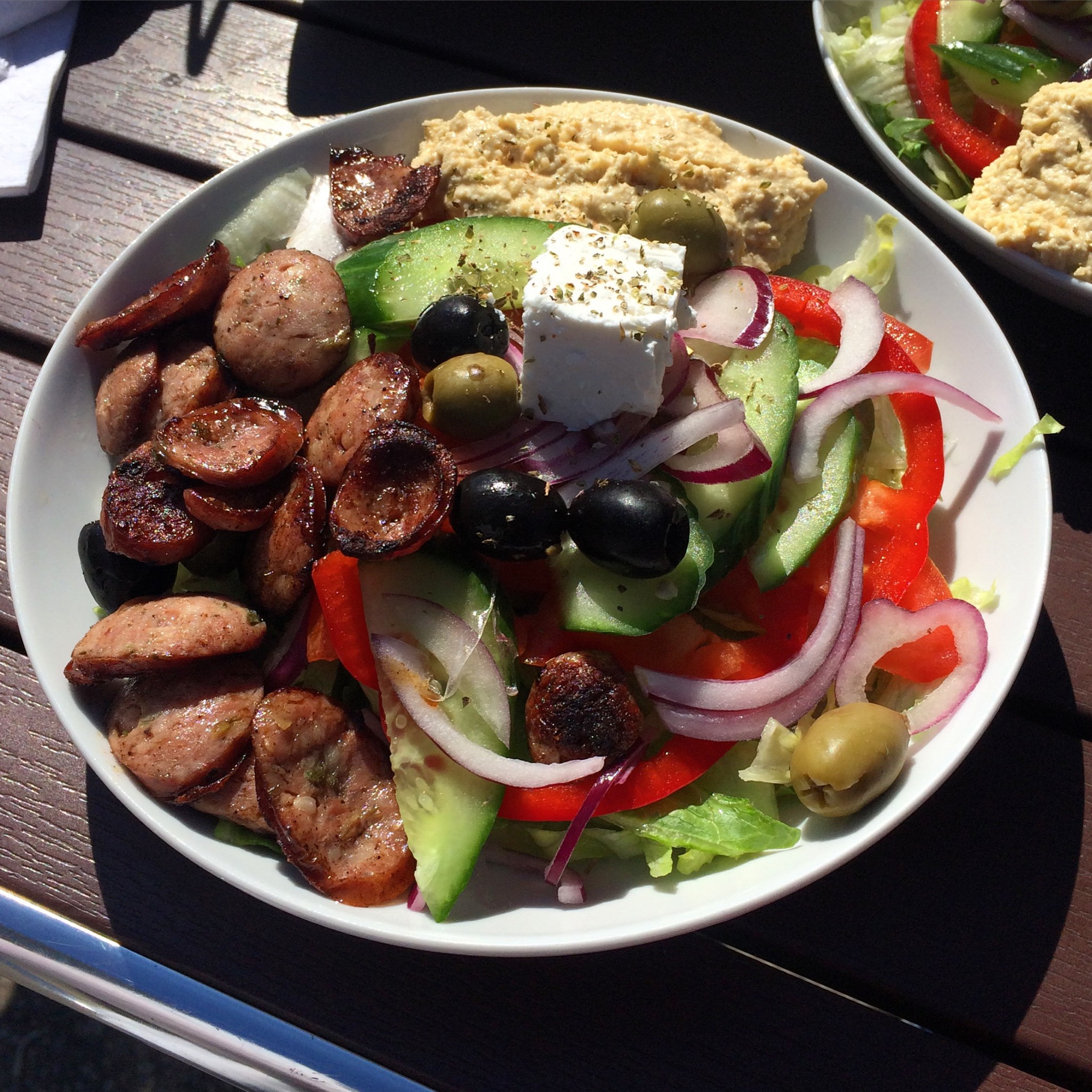 The menu consists of traditional Greek wraps, salads, sweets and iced coffee. I’ve tried both the wraps and salads and can confirm that they’re delicious and the portion sizes are very generous. I think my all time favourite order from Kosta’s Deli has to be the salad (they’re huge) which comes with a hunk of feta, hummus and lots of fresh crunchy leaves then a cheeky side of chips to share (go for the small, it’s still large). You can pick one of six fillings; gyros, chicken souvlaki, halloumi, falafel, loukanika and beef & lamb kofta. I’ve tried the chicken and loukanika and both are very tasty, the meat is juicy and seems to be of good quality. I must say that it’s the loukanika that I keep going back for, it’s just delicious, especially with fresh salad.