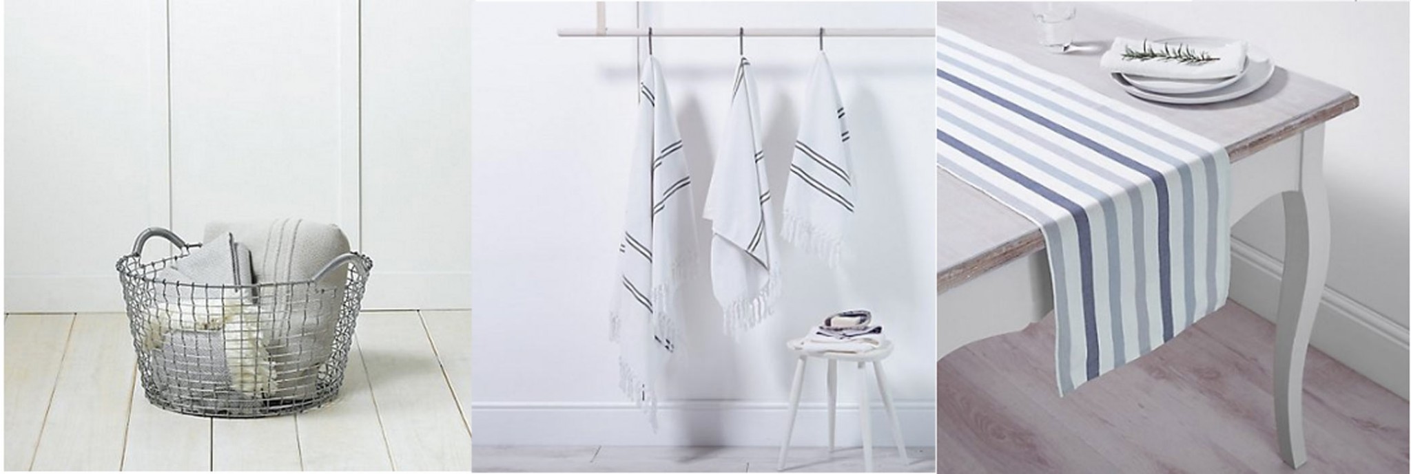 First you’ll see the Korbo basket which has been hand-woven from one piece of steel. I think the basket is a very neat and simple design but offers many practical uses. Practicality is something I’m trying to keep in mind whenever I buy something new. I think the basket would be useful for storing fresh towels in the bathroom or blankets and magazines in the lounge. Next are the lightweight Sorrento Hammam towels. Again, these are such a simple and crisp design with a sharp stripe detail. These towels are quick drying which makes them perfect for picnics in the garden, trips to the seaside and popping into your suitcase. Finally the Ile De Stripe runner is is a very easy way of adding interesting detailing to your dining table and is something you can bring out every summer. Just be careful not to spill red wine on it.