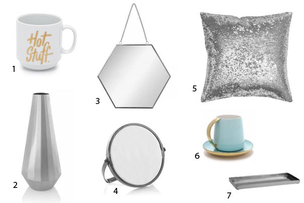 1 – Hot Stuff Mug | 2 – Oliver Bonas Metallic Vase | 3 – Oliver Bonas Hexagon Mirror | 4 – George Mirror | 5 – Sequin Cushion | 6 – Rosanna Inc Mug & Saucer | 7 – Metal Tray