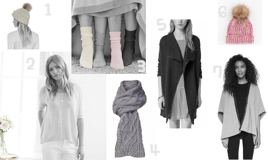 1 –Eugenia Kim Rain Hat 2 –The White Company Curved Hem Textured Jumper 3 – The White Company Cashmere Bed Socks 4 – House of Fraser Ugg Scarf 5 – House of Fraser Tommy Hilfiger Fenmore Cardigan 6 – Boden Chunky Knit Hat 7 – Three Dots Elizabeth Sherpa Poncho