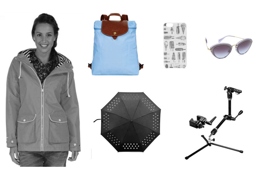 Regatta Yellow Jacket | SUCK UK Umbrella | Miu Miu Oval Cat Sunglasses | Longchamp Backpack | Kate Spade iPhone Case | Manfrotto Magic Arm Kit