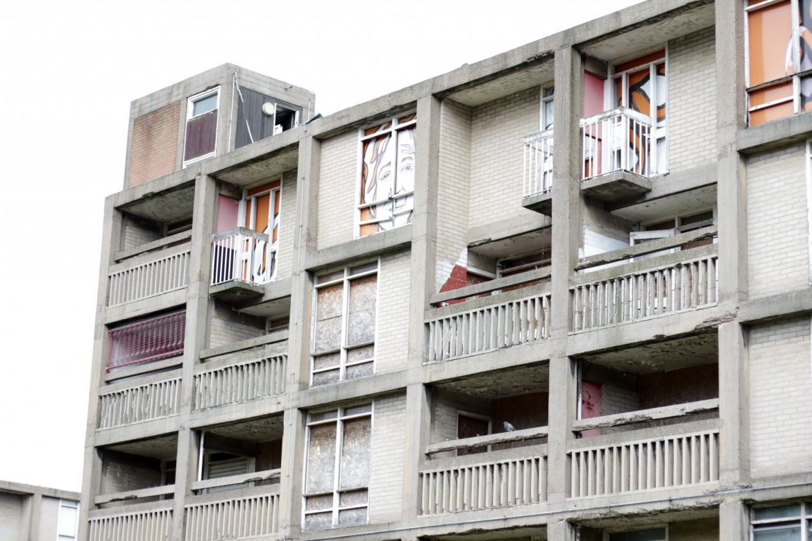 There’s a strange feeling as you walk between the old empty blocks. It’s a very dense area of flats and quite overwhelming. Most of the buildings are covered in graffiti with overgrown greens and smashed windows. They’re just sitting and waiting for their make-over.