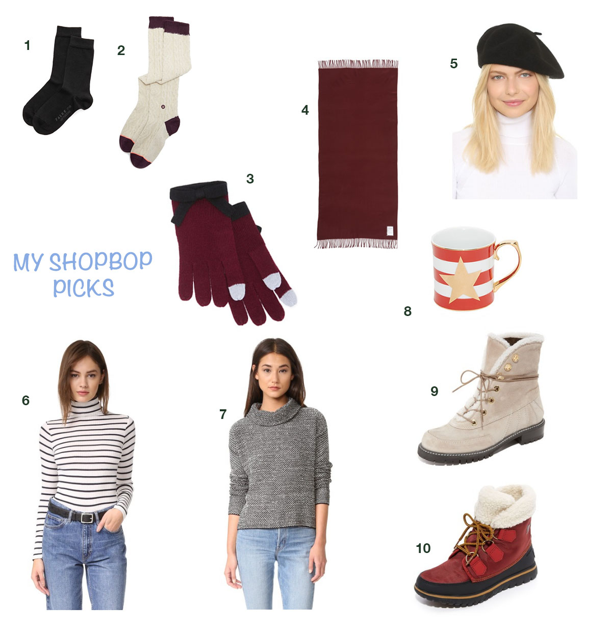 1 – Falke Socks 2 – Stance Socks 3 – Kate Spade Gloves 4 – Kenzo Cosy Scarf 5 – Wool Beret 6 – Club Monaco Julie Turtleneck 7 – Bobi Turtleneck Jumper 8 –Striped Star Mug 9 – Stuart Weitzman Forest Boots 10 – Sorel Carnival Boots