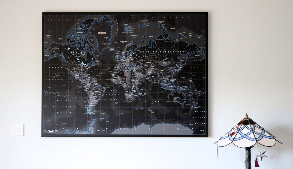 HelloCanvas have a really good selection with 8 maps to pick from. You can also opt for a full colour, black and white or sepia toned map. I decided to steer away from the traditional map on this occasion and picked out something a little more unique. I wanted something which would go well on an office wall or in the lounge in our next house. I decided the Black Ice World Map would be a good choice as I hadn’t seen one like it before. I’m so happy with my decision, it looks really chic and smart on the wall. It’s been a talking point for any pals who’ve visited and people always seem to be amazed at the locations of their favourite holiday destinations.