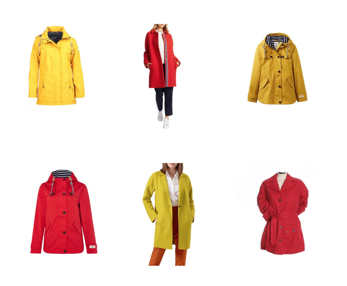 1 – Barbour Yellow Jacket | 2 – Grace & Oliver Red Coat | 3 – Joules Yellow Waterproof Jacket | 4 – Joules Waterproof Jacket | 5 – Hobbs Mimosa Coat | 6 – Red Barbour