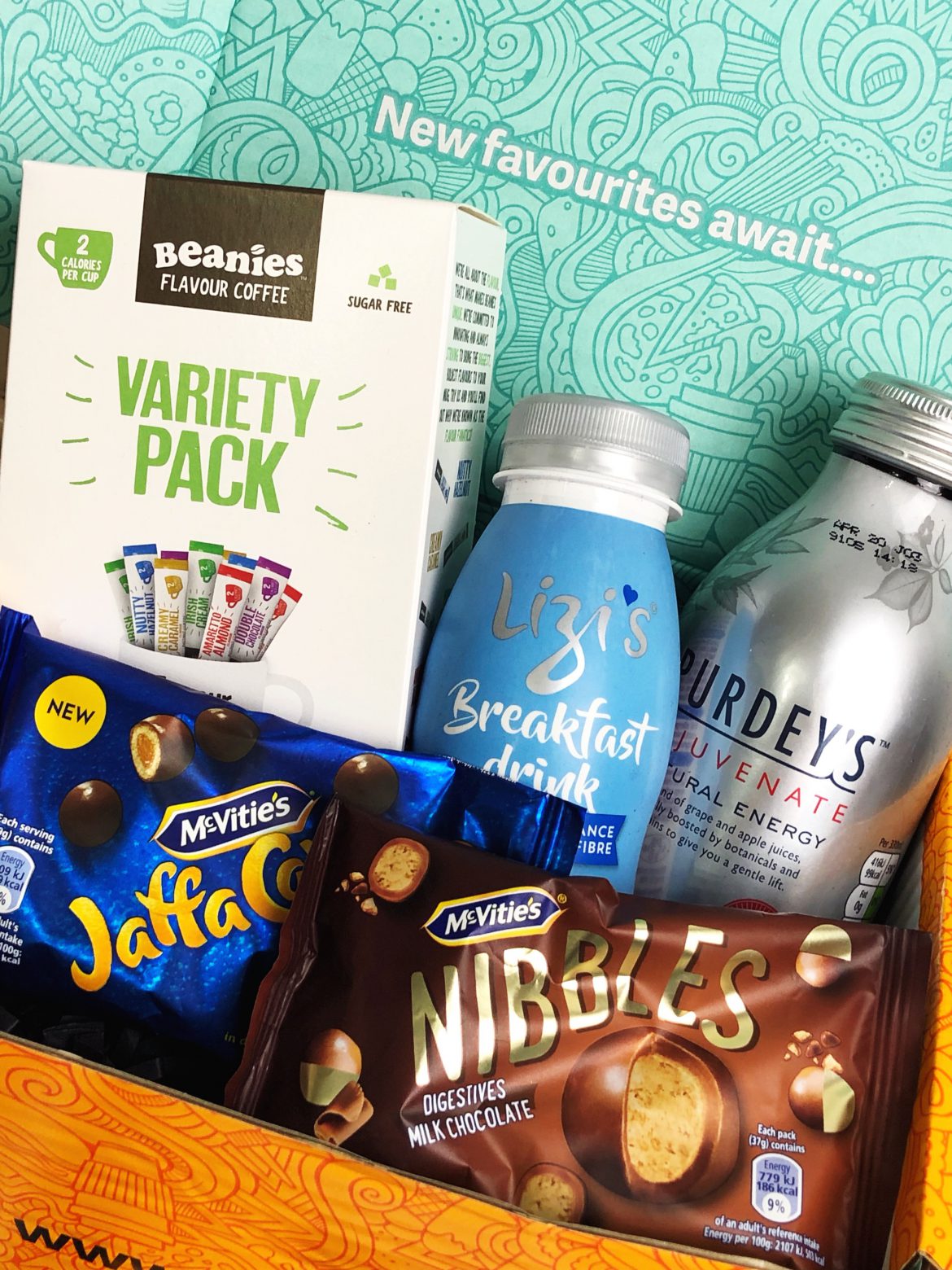The products included a Beanies Coffee variety box, a bottle of Lizi’s Breakfast Drink, Purdey’s Natural Energy, Digestive Nibbles, Jaffa Cake Nibbles.